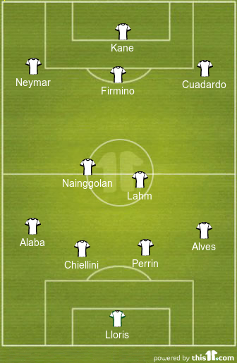 Aditya NayakOur Tactic is 4-2-3-1 with A normal Defensive line, a double pivot of Nainggolan and Lahm. Firmino will be playing in the hole whereas Neymar and turan will be Inside forward and Right winger respectively. HArry Kane will be the lone striker upfront.