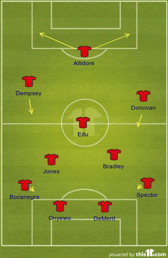 If we are going with a 5 man midfield we need to do one of 2 things. First would be to give Donavan and Dempsy the freedom to attack and create down the wings. The defense needs to defend better and the central 3 midfielders will need to close down the passing lanes. Donavan and Dempsy can't be used to defend. Alternatively we could put a creative player in the middle (I'd vote for Donavan actually) And have him stay central for a good outlet after we win back possession.