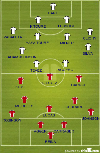 SUBS: DOWNING-AQUILANI-SKERTEL BALOTELLI-DZEKO-DE JONG