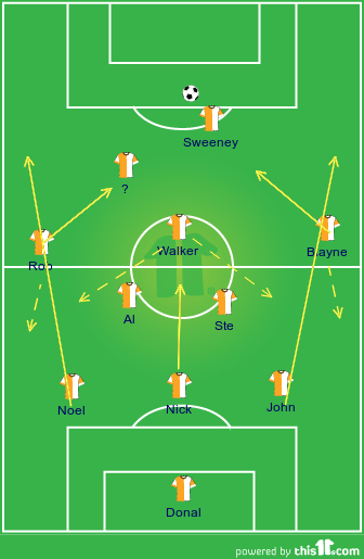 WozzyWalkervery much a counter attacking formation, Ste and Al with holding role in midfield. Nick the linchpin of a 3 man defence. Rob and Blayne out wide, whom tuck when Noel and John bomb foward allowing support. The two wingers dropping back when needed, same with myself. placing a 5 man midfield in front of the versatile 3 man defence. Al and Ste charged with launching counter attacks. Sweeney up front, pushing their defenders back with an unnamed player peeling off him.