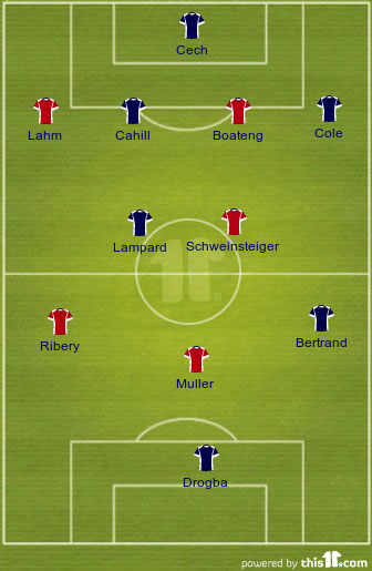Ribery left, Muller right, Kroos forward, Mikel sitting.