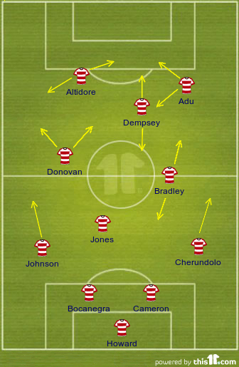 TheNearPostThis is similar to the last shape but now Adu is in the forward line. I think this gives the USA more variability and unpredictability in the final third. Dempsey can push further forward in the the forward line and Adu can release him, or vice-versa. This role also has limited defensive requirements from Freddy Adu without it being a huge detriment.
