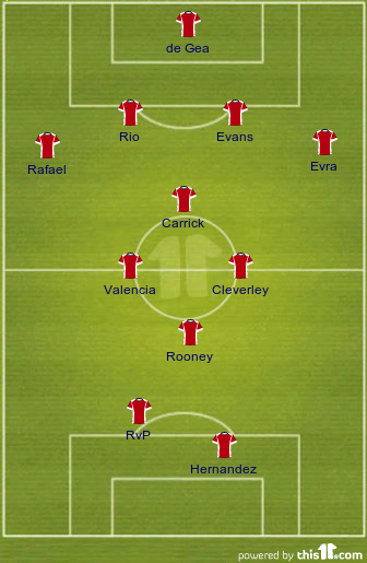 The_Black_MambaDue to injuries the back four picks itself so the main area of focus about this formation is the midfield and attack, and what formation should Fergie deploy on Sunday. I've gone for a diamond midfield, I know it didn't work on Tuesday but against Chelsea it could. Up front I've gone for two players who I think are more reliable in getting us goals in tight games, RvP is on fire and Hernandez once again showed against Braga that he is a great "fox in the box" type of player.